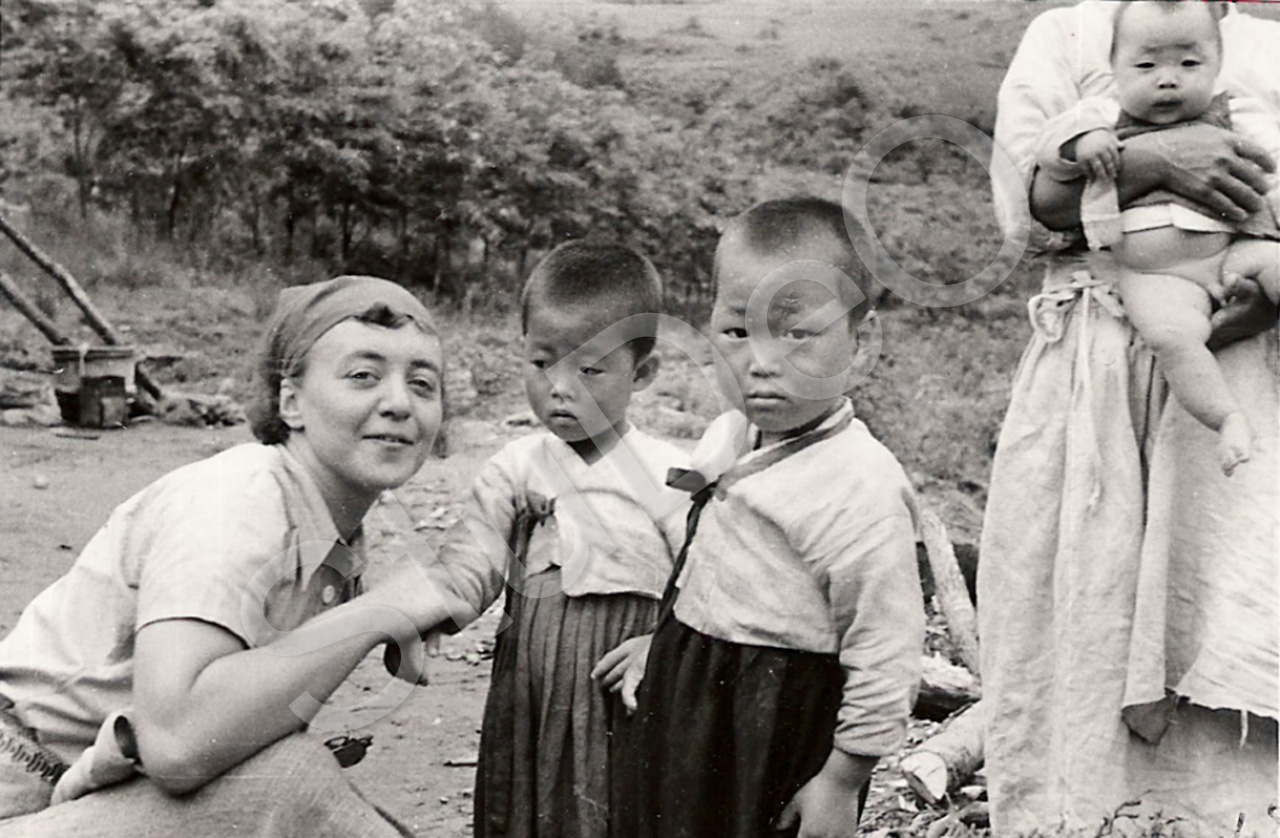 Beschreibung: Renata Steenken mit koreanischen Kindern. „Diese Kinder sahen wohl zum ersten Mal eine Fremde!“.
