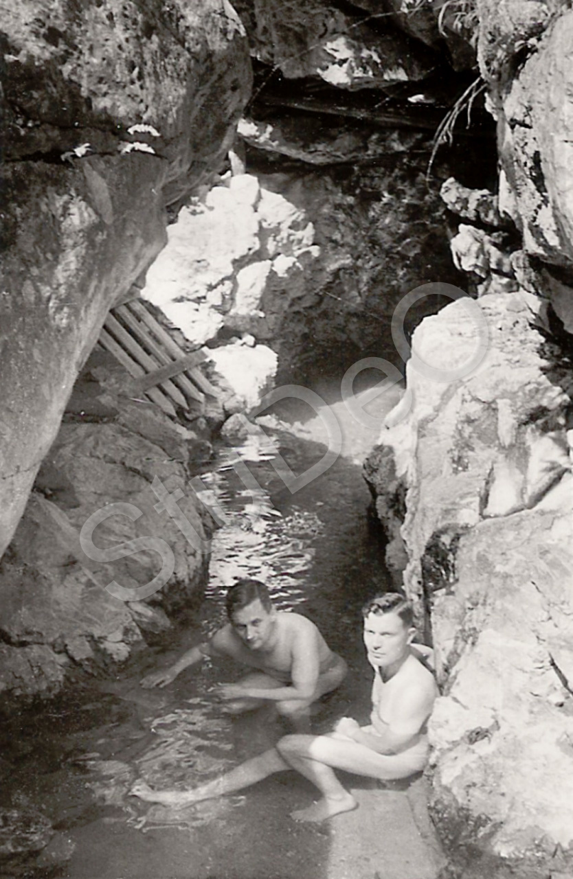 Beschreibung: Warme Quellen in den Bergen. Dr. Petz (li) und Benno Volk (beide Ti) baden.