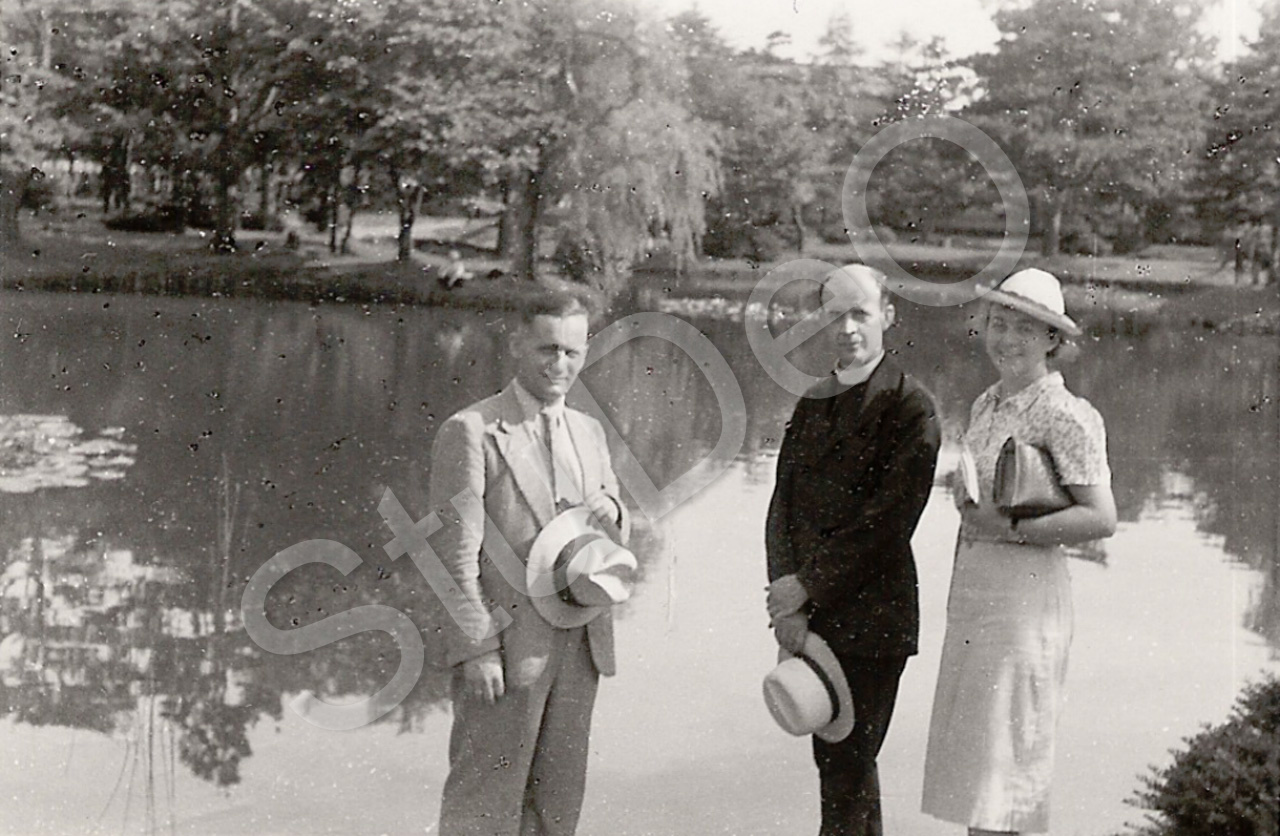 Beschreibung: Gustav und Renata Steenken mit einem Pfarrer am See.