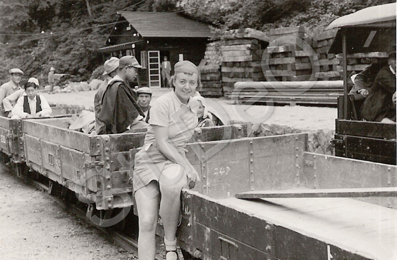 Beschreibung: Renata Steenken sitzt auf einem Wagon einer Holzbahn „Mit einer Holz­bahn sind wir hoch in die Berge gefahren mit 3 übereinander liegenden Seeterrassen, in einer imposanten Bergwelt“.