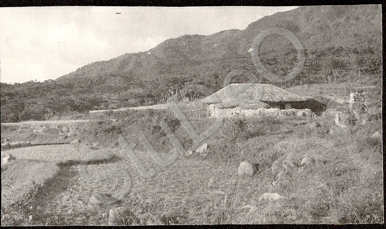 Beschreibung: Strohgedecktes Haus in Berglandschaft. In Sukulam?