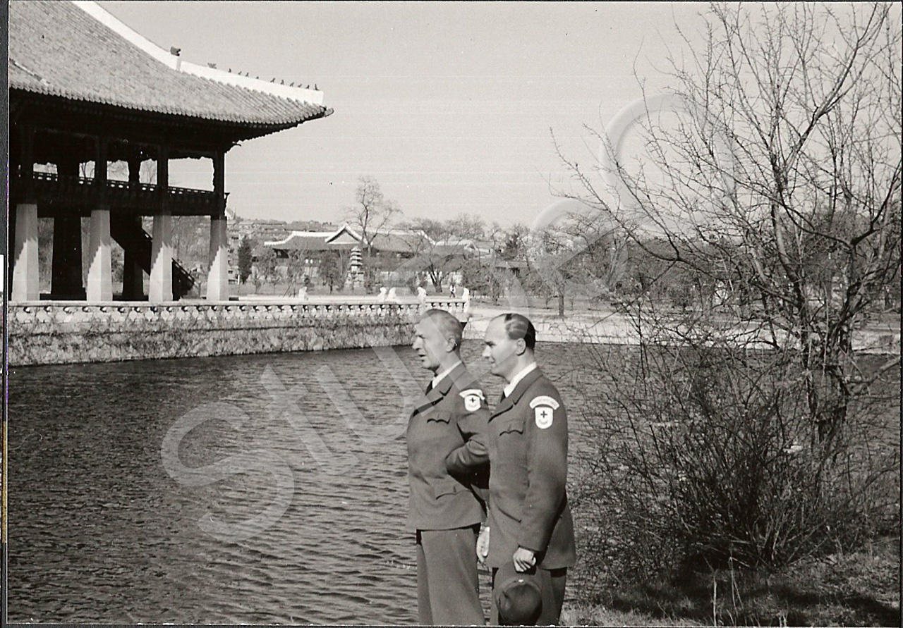 Beschreibung: Dr. Günther Huwer in Rote Kreuz-Uniform (li) mit einem Kollegen vor einer Pagode von Wasser umgeben. Vermutlich in Seoul.