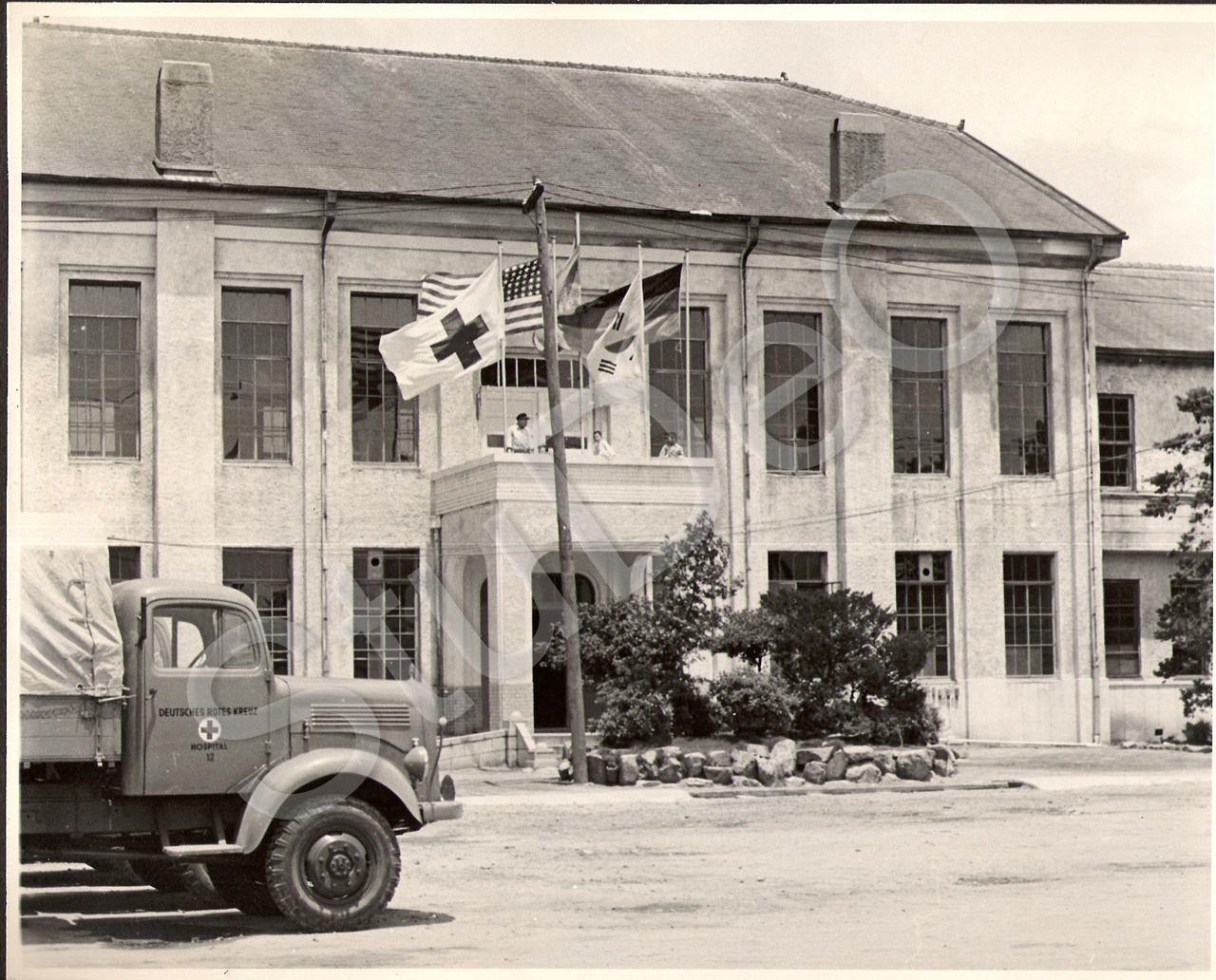 Beschreibung: Krankenhausgebäude. In der ehemaligen Mädchenschule befand sich das US-Army-Krankenhaus.Am17.5.1954 wurde sie gräumt und die Ärzte des Rote Kreuz zogen ein. Es war bis zum 31.03.1959 das deutsche Rote Kreuz Hospital eingerichtet. 250 Betten. Amerikanische, Koranische und Deutsche Fahnen wehen am Balkon über dem Eingang.