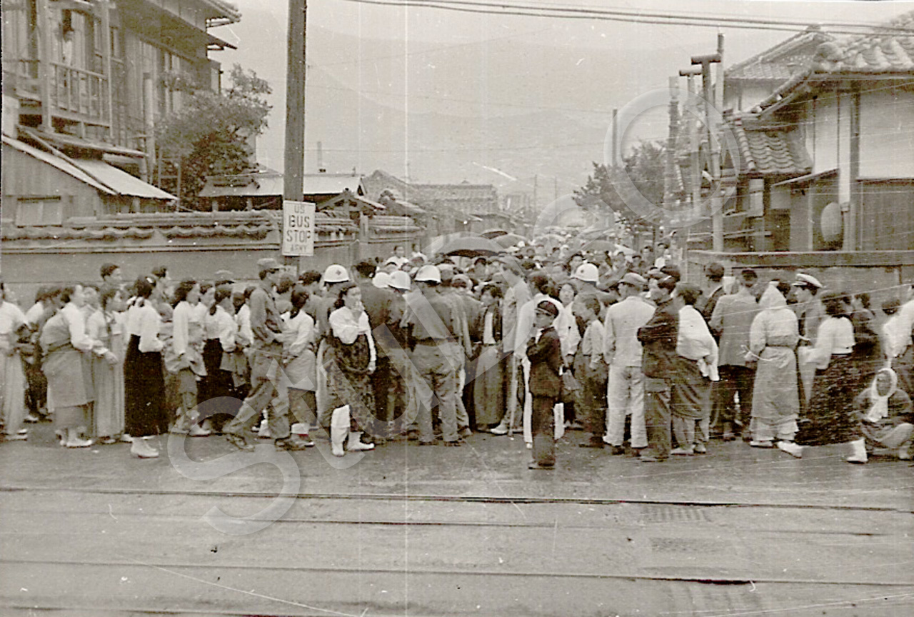 Beschreibung: Bei der Eröffnung des Rote Kreuz Hospitals in Pusan stauten sich die Kranken und Hilfesuchenden Koreaner zu Tausendend gegenüber dem Hospital.