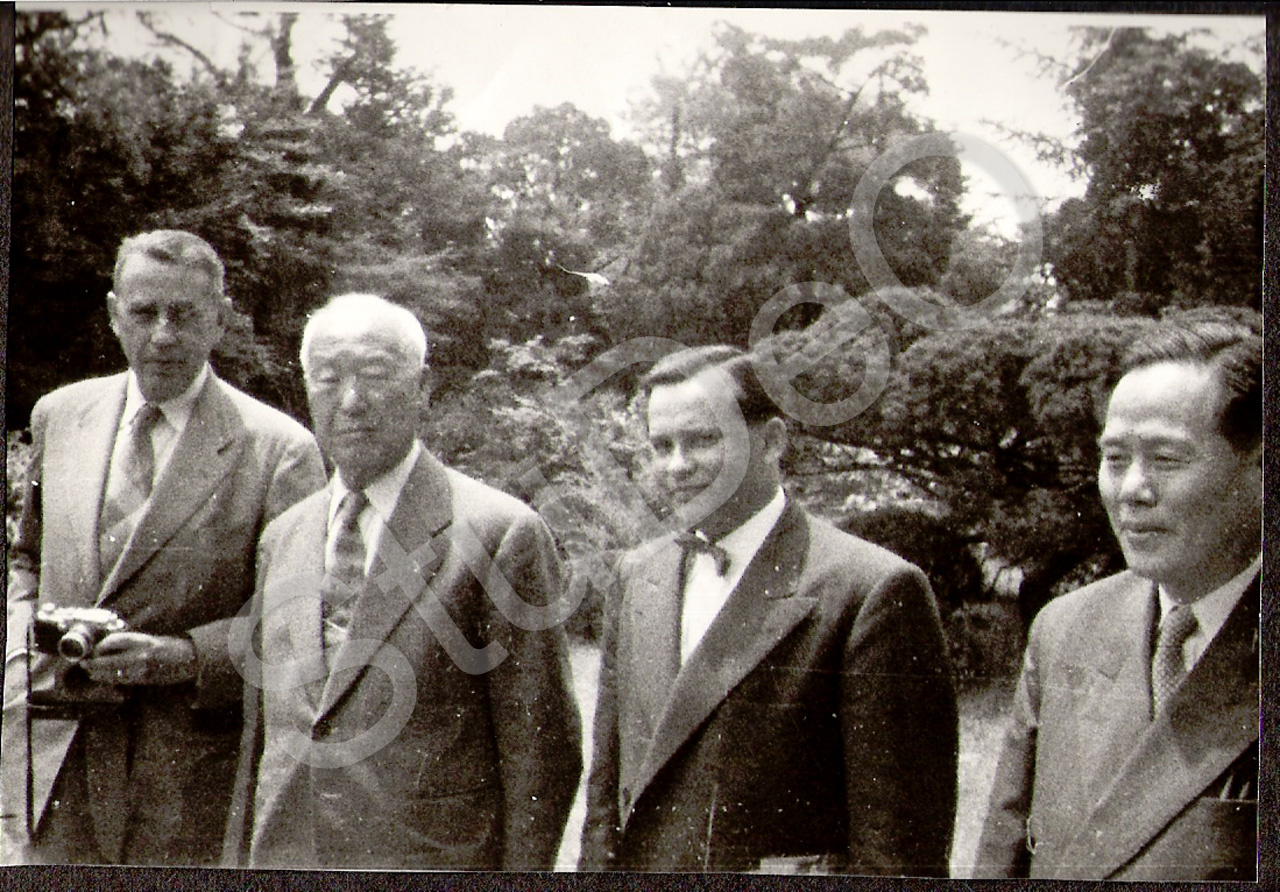 Beschreibung: Empfang des Demag Direktors Borssens (li.?) beim koreanischen Staats­präsident Syngman Rhee (2.v.li.) in Gegenwart des koreanischen Industrieministers u. des Münchner Emigranten Max Landau.