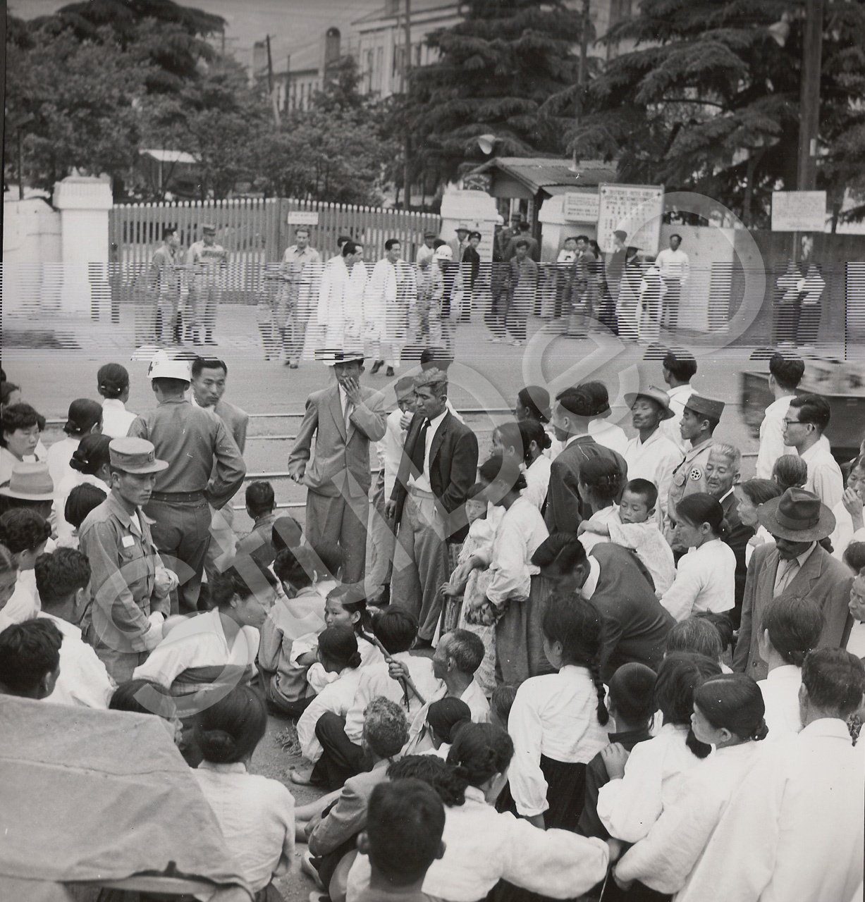 Beschreibung: Eröffnung des Deutschen Rote Kreuz Krankenhauses durch Prof. Günther Huwer. „Hunderte von Kranke warten vor dem Hospital auf die Stunde der Eröffnung. Patienten werden nach Schwere des Falles und nach Bedürf­tigkeit ausgesucht.“ Blick auf das Eingangstor zum Hospitalge­lände, rechts vom Eingangstor die Pforte für die Fußgänger.