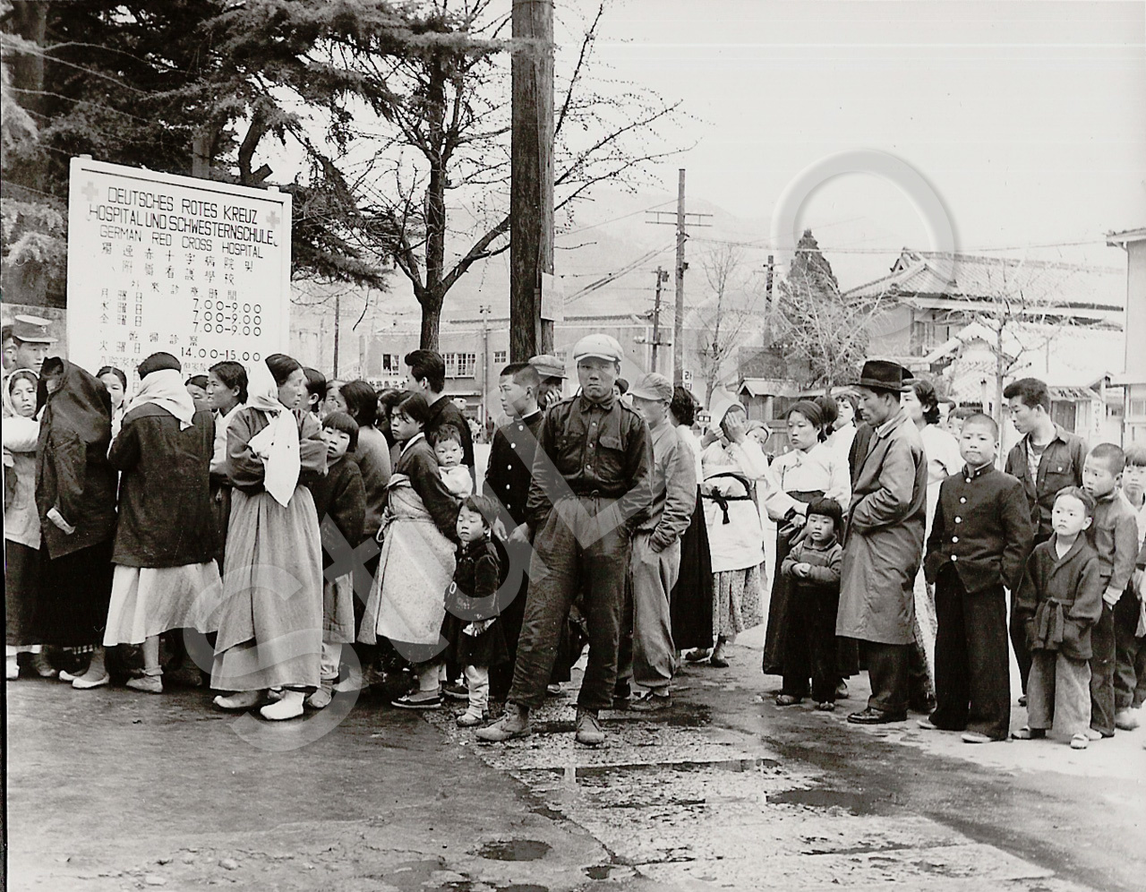 Beschreibung: Patienten stehen Schlange weit in die Straße vor der Fußgängerpforte des neu eröffneten Deutschen Rote Kreuz Hospitals Pusan.