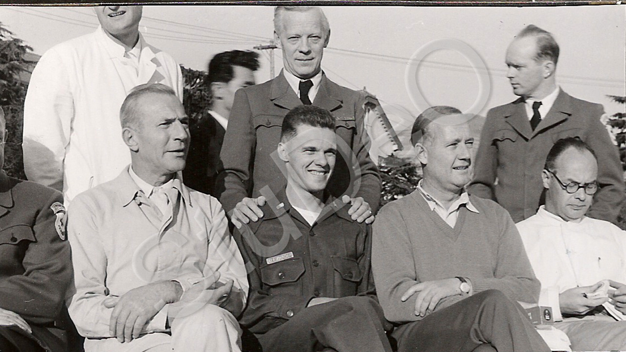 Beschreibung: Ausschnitt aus dem Bild P6519 der Belegschaft des Rote Kreuz Hospitals in Pusan am 24.11.1954. Sitzend v.li. Prof. Günther Huwer, amerikanischer Verbindungs­offizier, Prof. Germer, Dr. König. Stehend: ?, Intendant Zimmermann, Dr. Gerlituky.