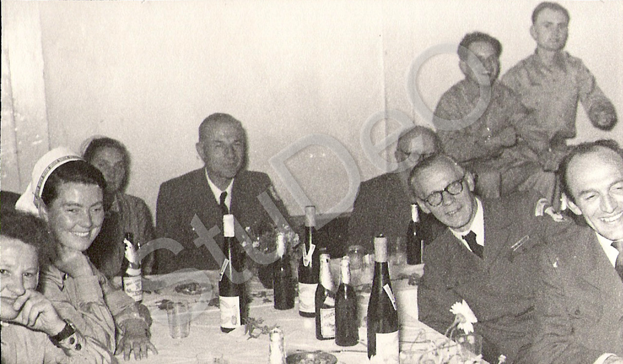 Beschreibung: Ärzte u. Schwestern des Rote Kreuz Hospitals Pusan feiern Weihnachten am 25.12.1954. Bei Tisch.