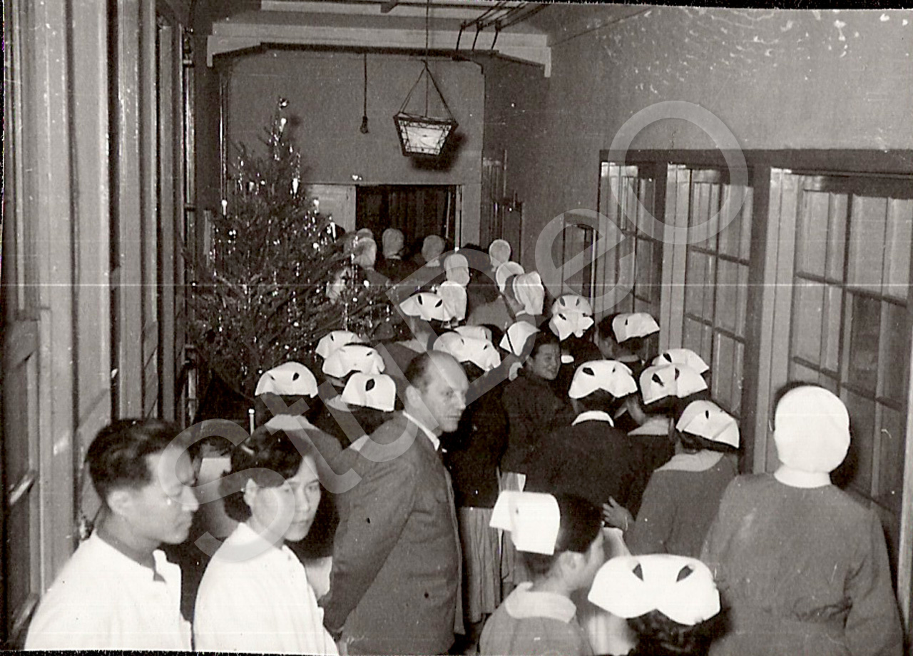 Beschreibung: Ärzte gehen anlässlich Weihnachten in einen Krankensaal im Rote Kreuz Hospital Pusan am 25.12.1954.