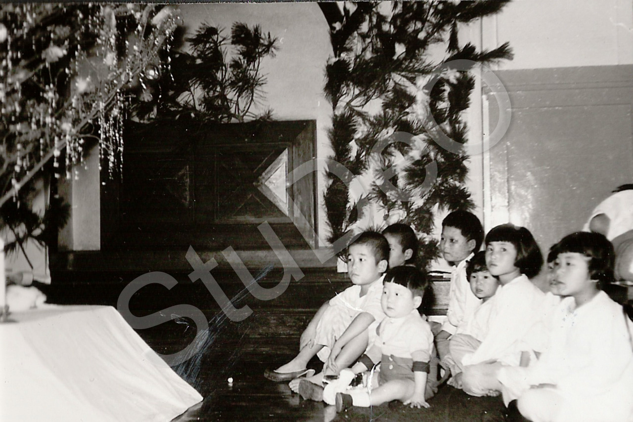 Beschreibung: Dt. Rote Kreuz Hospitals Pusan am 25.12.1954. Kinder gucken auf Gabentisch.