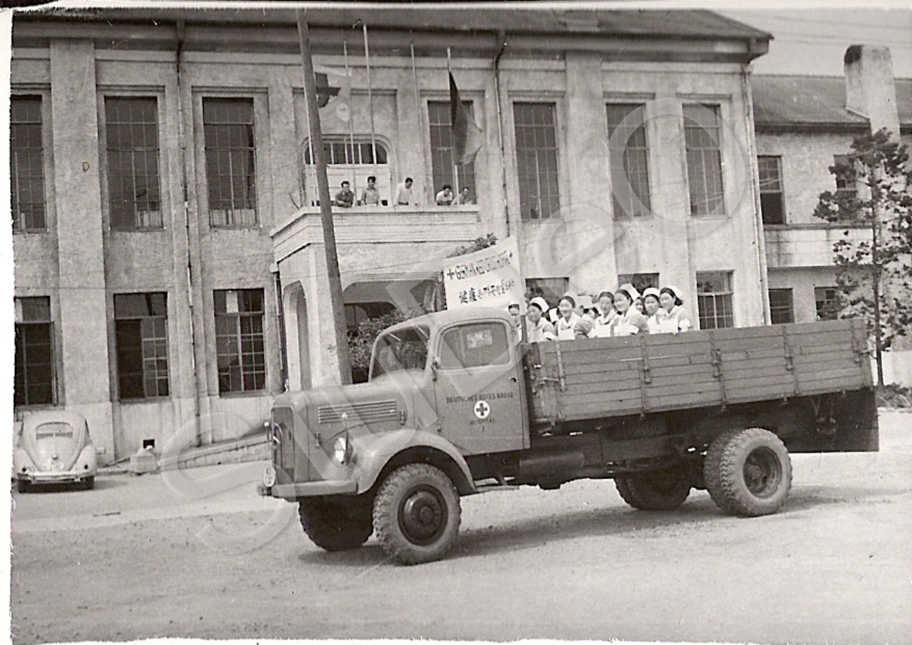 Beschreibung: Krankenhausgebäude des Rote Kreuz Hospital. Krankenschwestern im Lastwagen.
