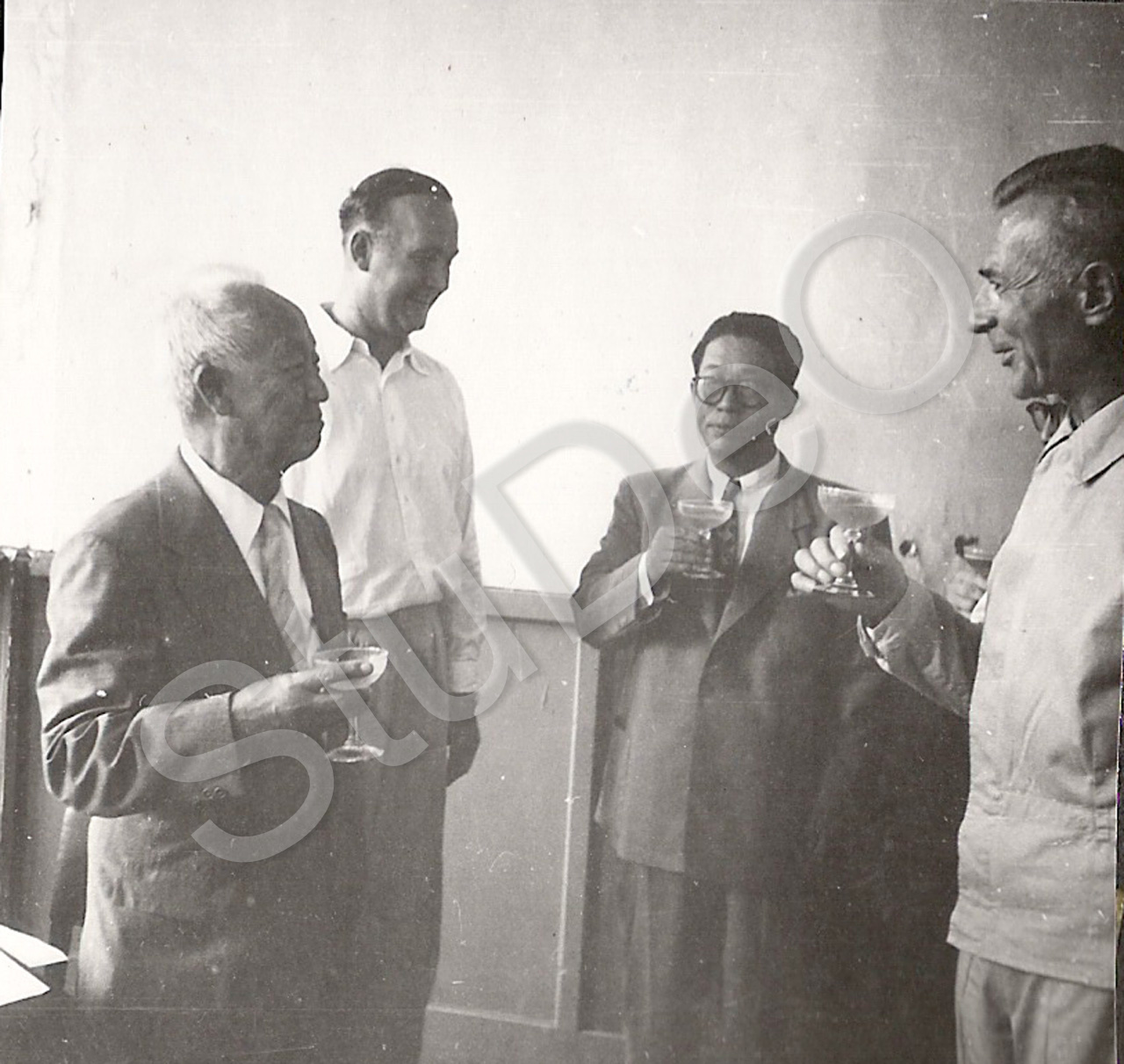 Beschreibung: Besuch vom kor. Staatspräsident Syngman Rhee (li.) im Deut­schen Rote Kreuz Hospital Pusan, Prof. Günther Huwer begleiten ihn. Umtrunk am 10.01.1955.