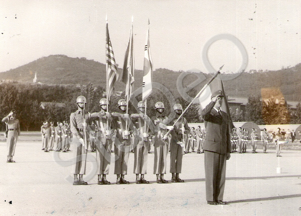 Beschreibung: Prof. Günther Huwer salutiert am 28.09.1956 vor den Fahnenträgern.