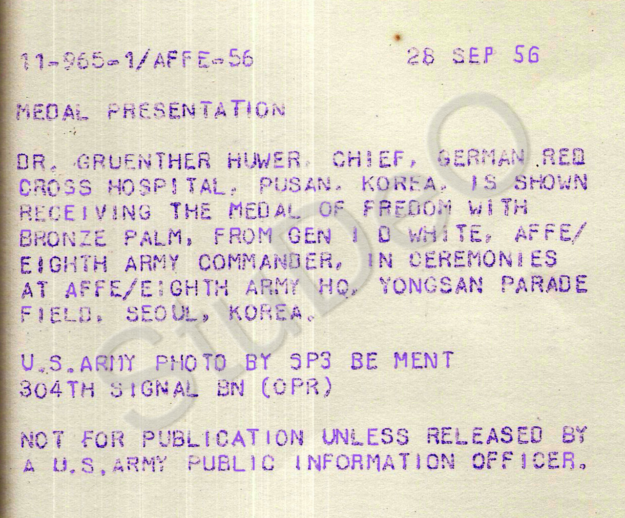 Beschreibung: Beschriftung des Fotos P6501 (Prof. Günther Huwer erhält die „Medal of fredom) von der US Army.