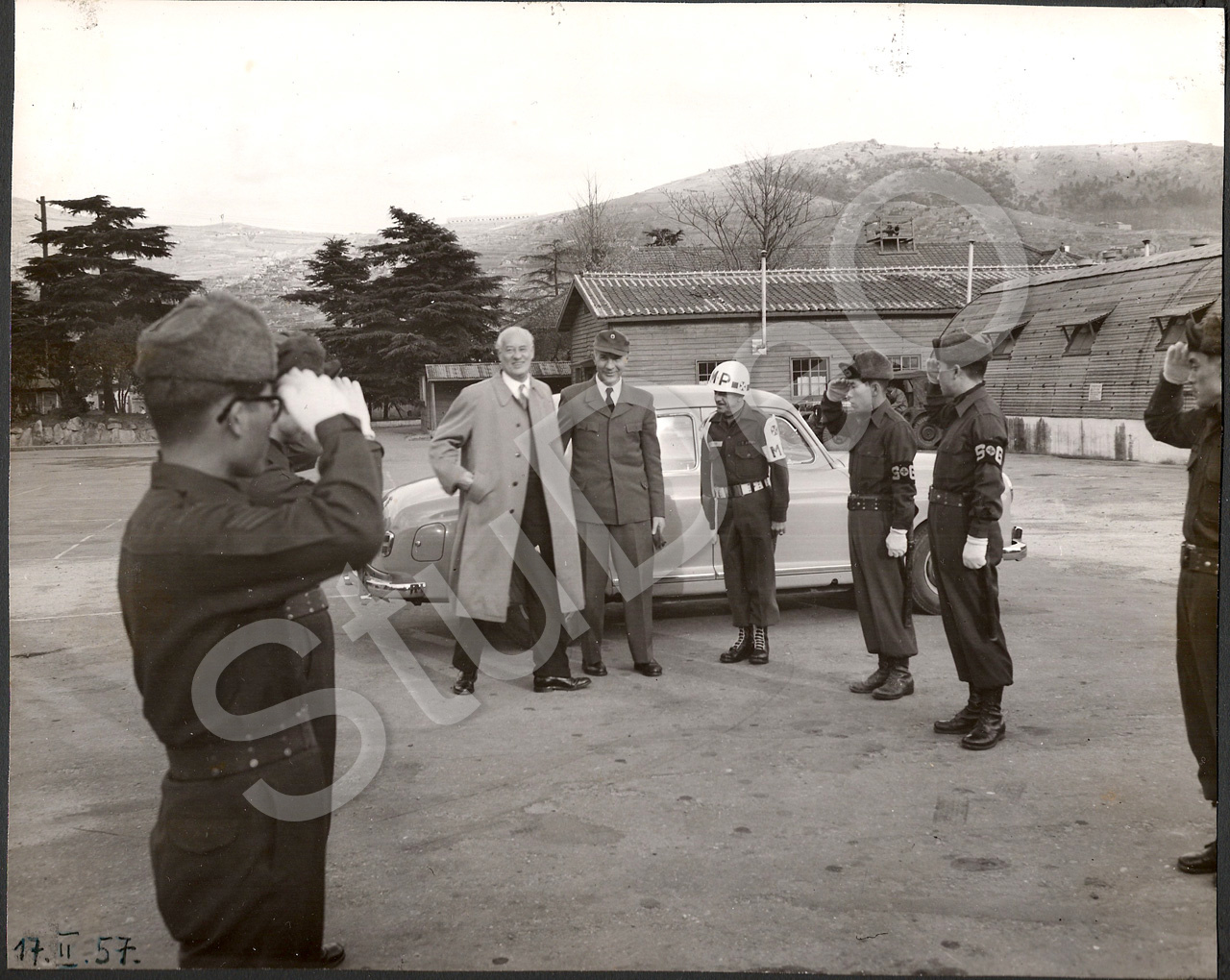 Beschreibung: Prof. Günther Huwer empfängt Botschafter Herz (weiße Haare) in Korea im Deut­schen Rotes Kreuz Hospital. MP und Koreanische Polizisten, die unter US-Army stehen. re. eine Nissenhütte am 17.02.1957.