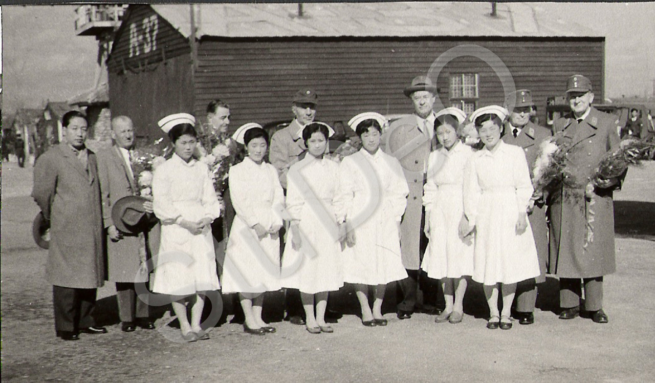 Beschreibung: „Verabschiedung von  Bundesarzt Burmann und Ritgen“ (mit Blumen re.) In der Mitte Prof Günther Huwer, re. daneben Deutsche Botschafter in Korea Herr Herz. Auf dem Gelände des Deut­schen Rotes Kreuz Hospitals Pusan am 17.02.1957.