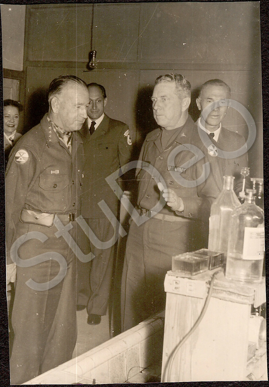 Beschreibung: General Joe White li. und weiterer Offizier der US-Army beim Besuch im Rote Kreuz Hospitals Pusan, hinten re. Prof. Günther Huwer.