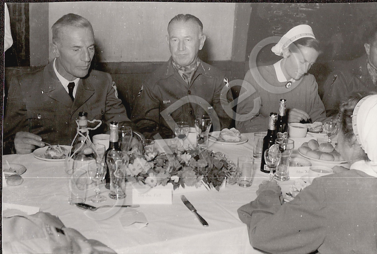 Beschreibung: Prof. Günther Huwer, General White, Schwester Isa v.d. Geltz beim Essen im Deut­schen Rote Kreuz Hospital Pusan.