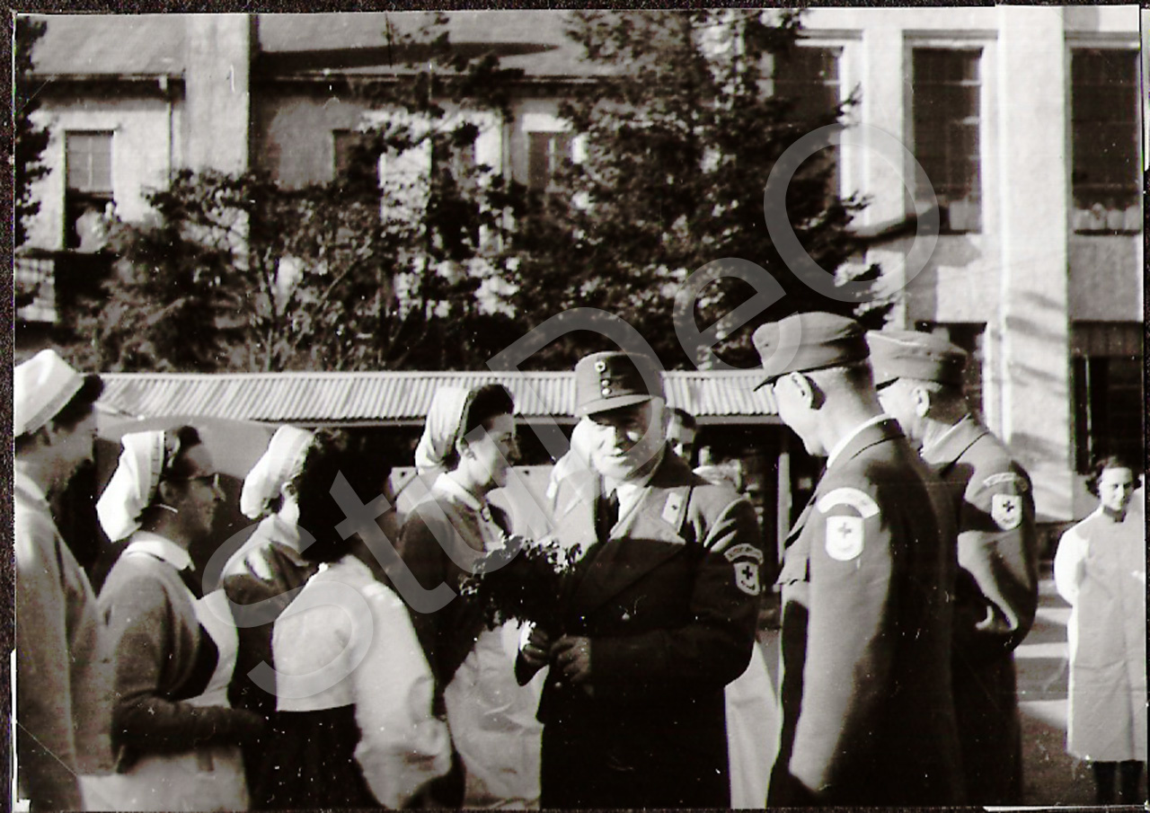 Beschreibung: Empfang vom Besuch aus Deutschland Herr Burmann, vor den Hauptge­bäude des Rote Kreuz Hospitals Pusan.