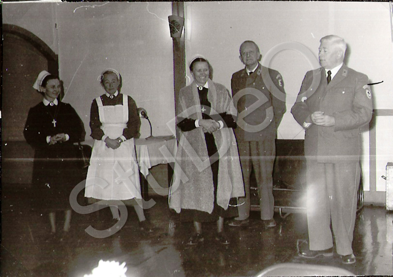 Beschreibung: Bundesarzt Burmann (ganz re.) hält eine Ansprache bei seinem Besuch beim Rote Kreuz Hospital Pusan. Generaloberin Fr. von Oertzen 3. von li.