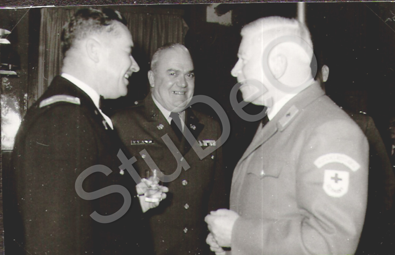 Beschreibung: Bundesarzt Burmann (re.) aus Deutschland im Rote Kreuz Hospital unterhält sich mit Offizieren der US-Army.
