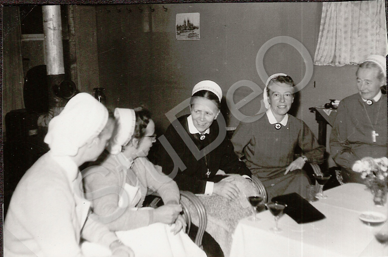 Beschreibung: Generaloberin Fr. von Oertzen (Mitte in Schwarz) in kleiner Runde mit Schwestern des Rote Kreuz Hospitals in Pusan.