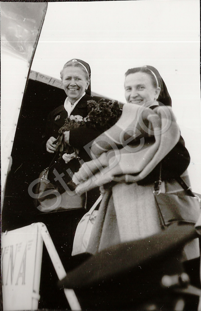 Beschreibung: Abschied vom Rote Kreuz Hospitals in Pusan. Generalo­be­rin Fr. von Oertzen besteig mit ihrer Begleiterin das Flugzeug.