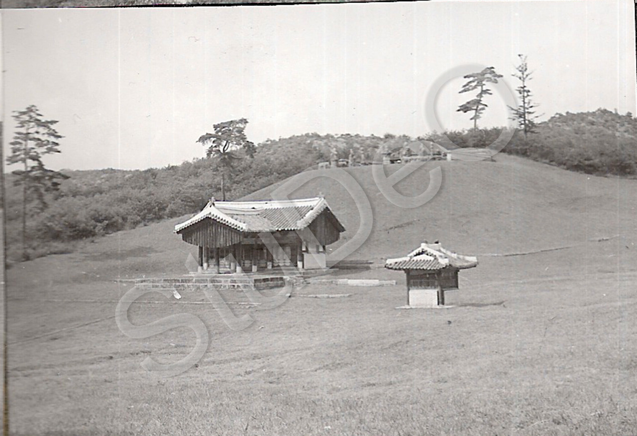 Beschreibung: Steinfiguren und Pavillons in Grabanlage in Seoul.