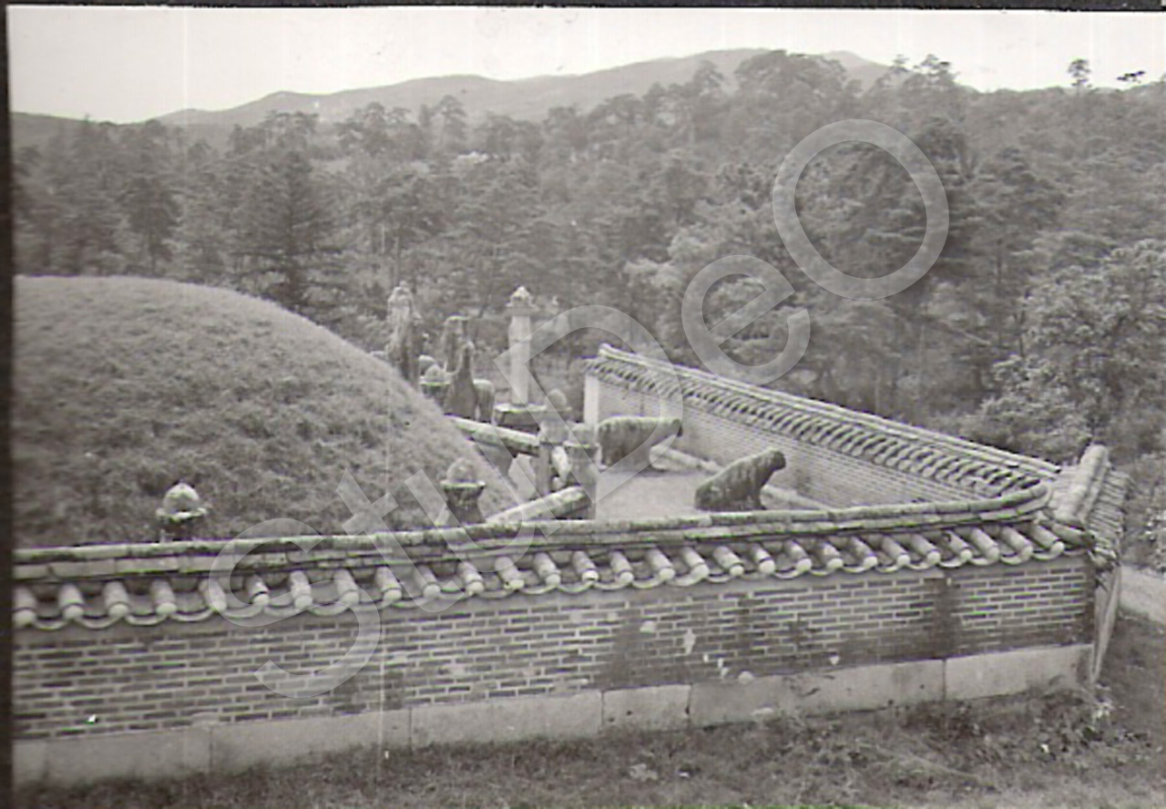 Beschreibung: Grab mit Mauer und Steinfiguren in Seoul.