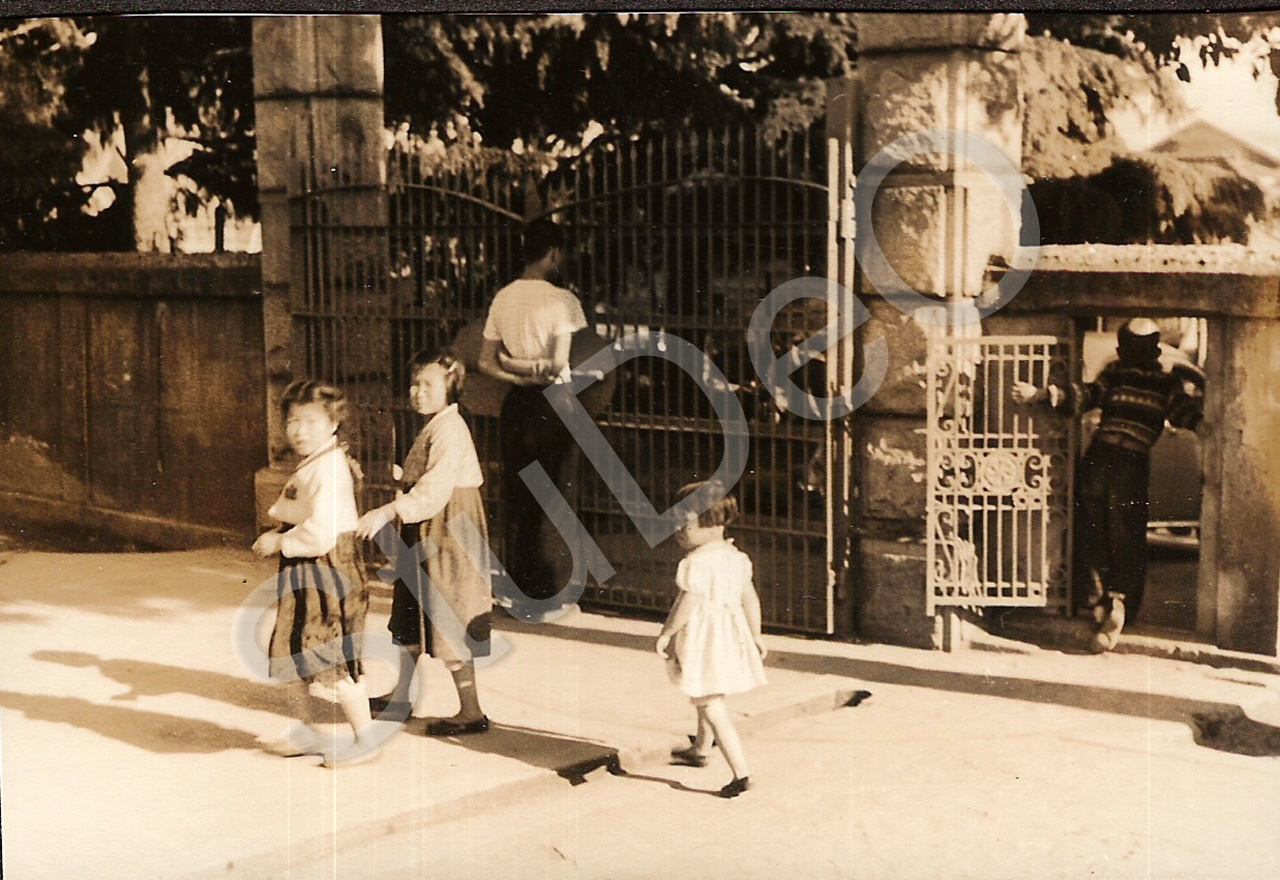 Beschreibung: Mädchen vor einem Gittertor vermutlich in Pusan.