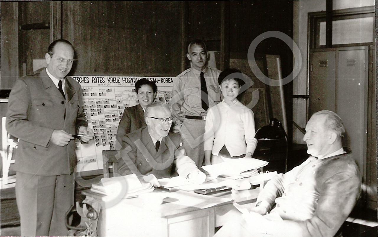 Beschreibung: Im Büro des Dt. Rote Kreuz Hospitals Pusan. v.li. Herren Probst u. Wit­ting, Fr. Thürmer, Herren Jung u. Ritgen.