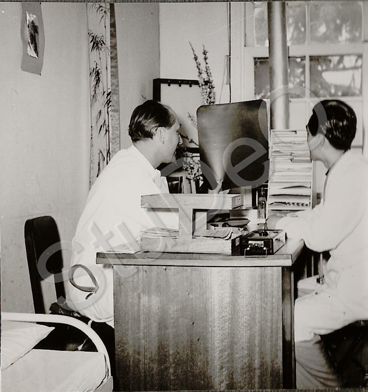 Beschreibung: Dt. Rote Kreuz Hospitals Pusan. In der Radiologie. Eine Röntgenauf­nah­me wird studiert.