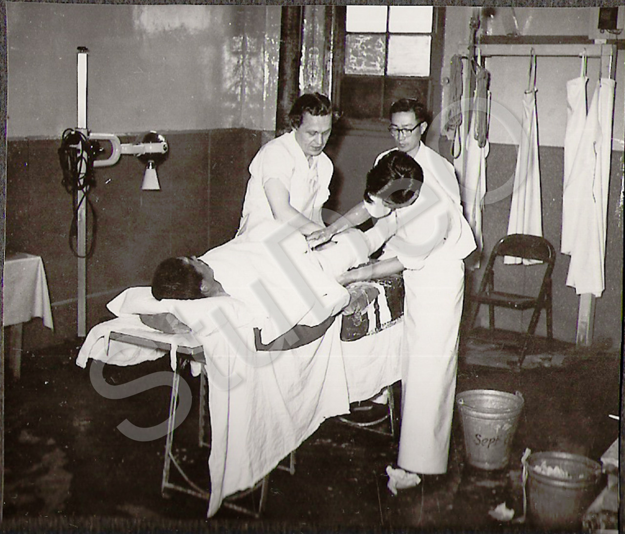 Beschreibung: Dt. Rote Kreuz Hospitals Pusan. In der Radiologie. Das Bein eines Patienten wird eingegipst.
