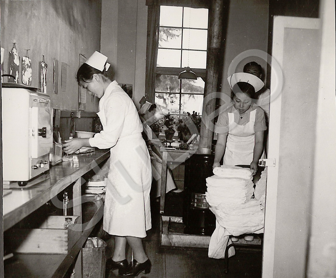 Beschreibung: Dt. Rote Kreuz Hospitals Pusan. Korenische Schwestern im Schwestern­zimmer für den Operationssaal.