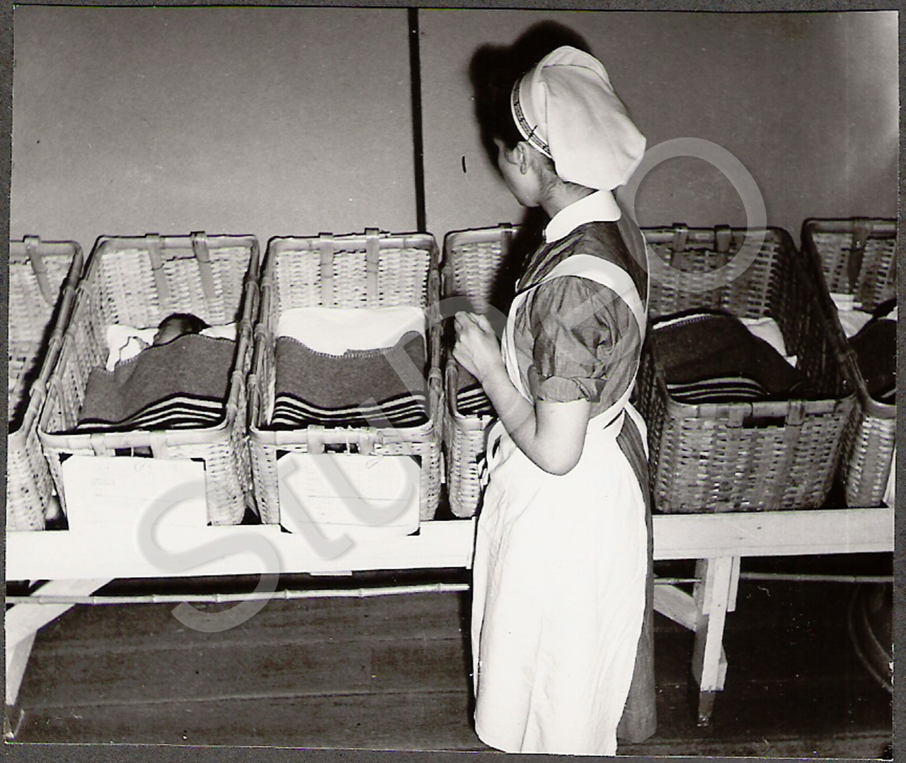 Beschreibung: Dt. Rote Kreuz Hospitals Pusan. In der Babystation. Babys schlafen in Korbbetten.