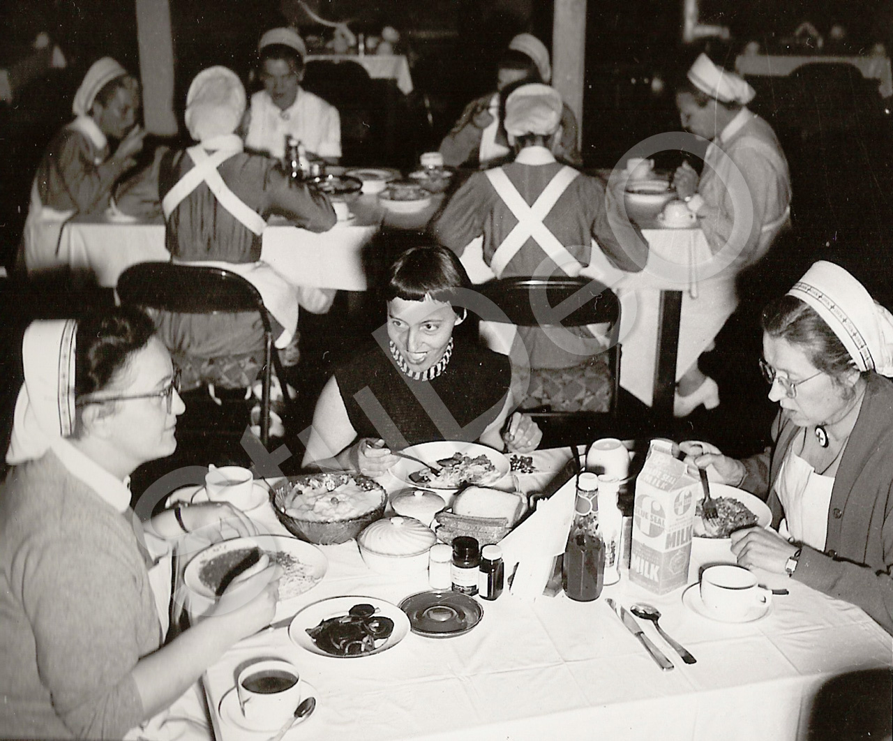 Beschreibung: Dt. Rote Kreuz Hospitals Pusan. „Im Speisesaal der deutschen Ange­stell­ten Ärzte und Schwestern“.