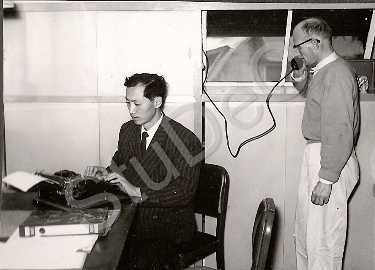 Beschreibung: Dt. Rote Kreuz Hospitals Pusan. Herren Simon Hou und Prüfer, Leiter des Fuhrparks?
