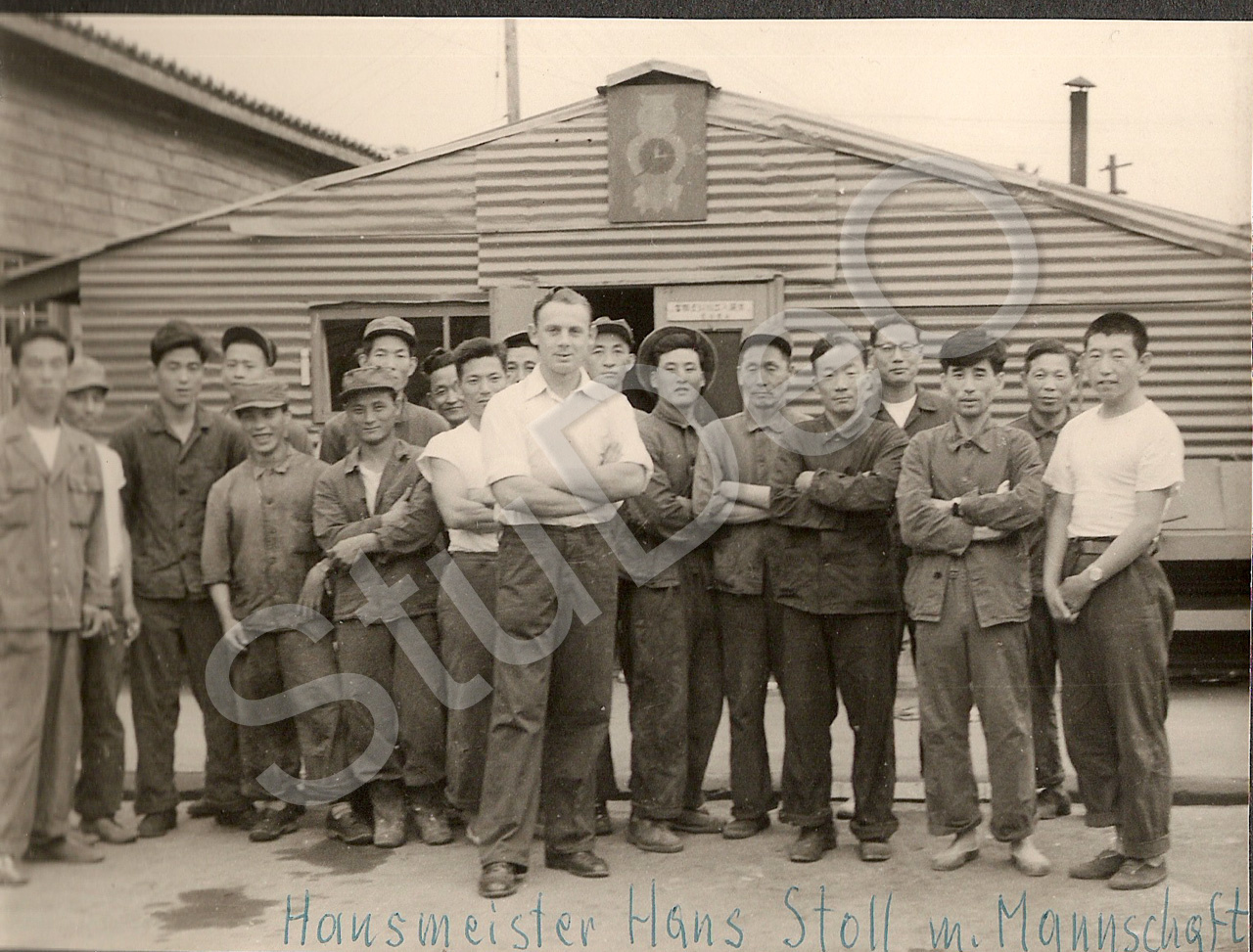 Beschreibung: Der Hausmeister Hans Stoll des Dt. Rote Kreuz Hospitals Pusan mit seiner Mannschaft vor einer Halle im Hospitalgelände. „Wagenpark“.