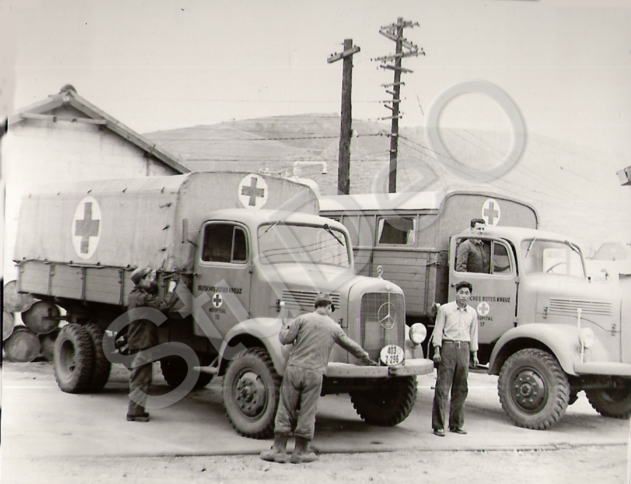 Beschreibung: Dt. Rote Kreuz Hospitals Pusan. „Wagenpark“.  Zwei der 5 LKWs des Hospitalfuhrparks.