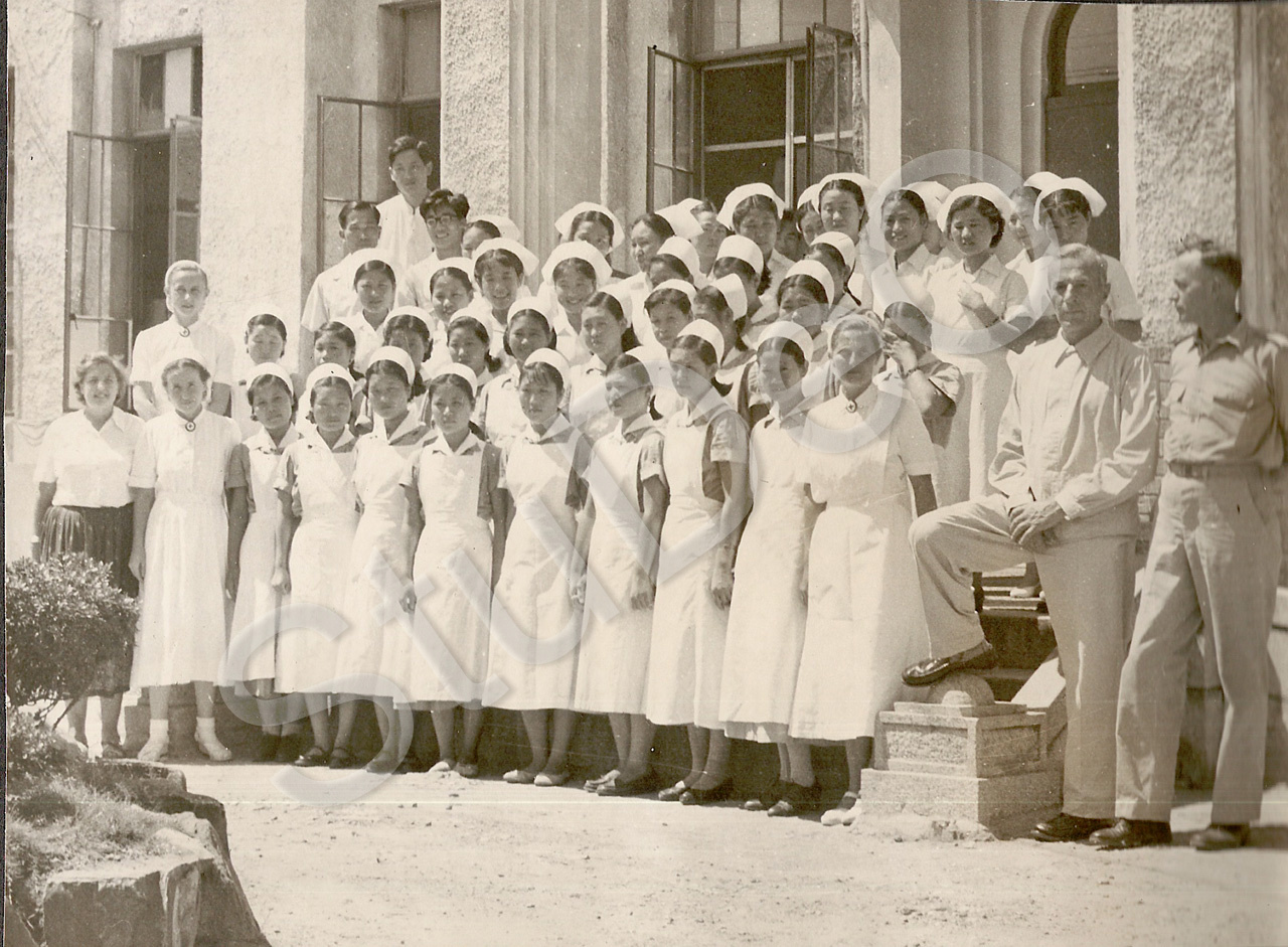 Beschreibung: Dt. Rote Kreuz Hospitals Pusan. „“. Schü­lerinnen (Angänger) aus der Schwesternschule. 2. v.re. Prof. Günther Huwer.