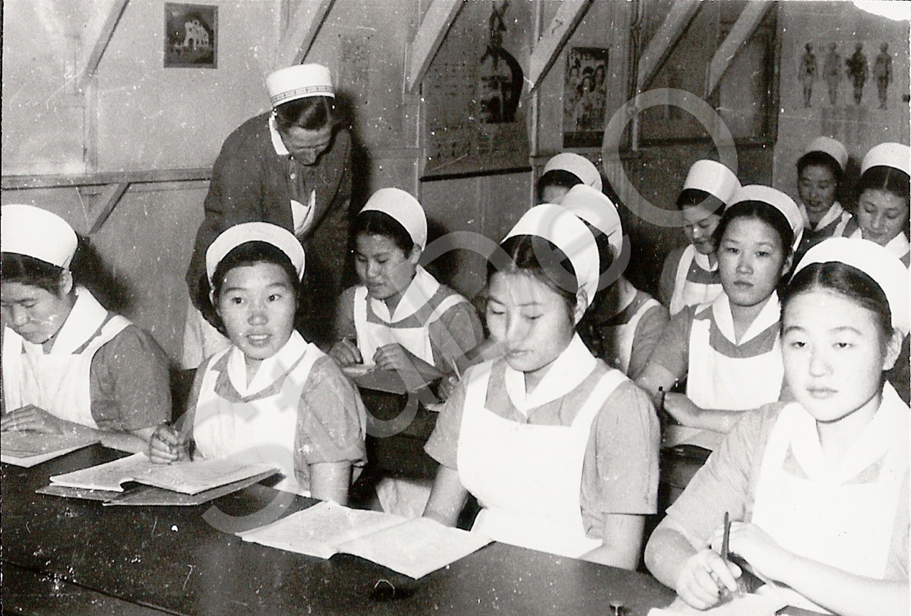 Beschreibung: Dt. Rote Kreuz Hospitals Pusan. „Schwesternschule“. Schwesternschü­ler im Unterricht.