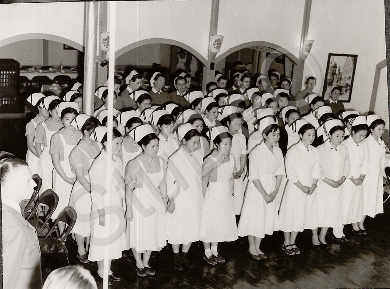 Beschreibung: Dt. Rote Kreuz Hospitals Pusan. „Schwesternschule“. Schwesternschü­ler, die eine Prüfung bestanden haben, sie haben weiße Hauben mit Schräg­streifen.
