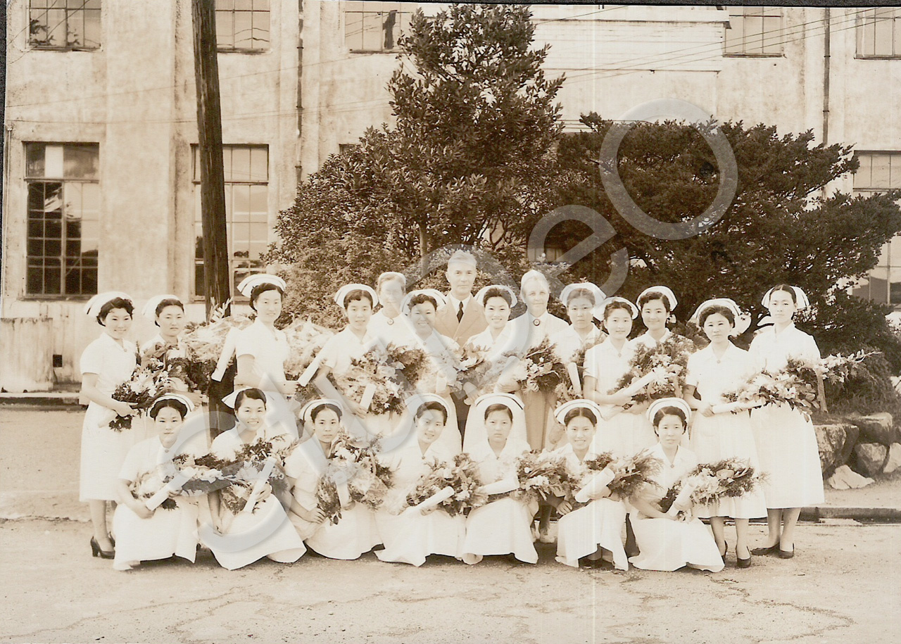 Beschreibung: Dt. Rote Kreuz Hospitals Pusan. „Schwesternschule“. Ausgelernte, grad­u­ir­te Schwestern vor dem Hospitalgebäude. Hinten Mitte Prof Günther Huwer.