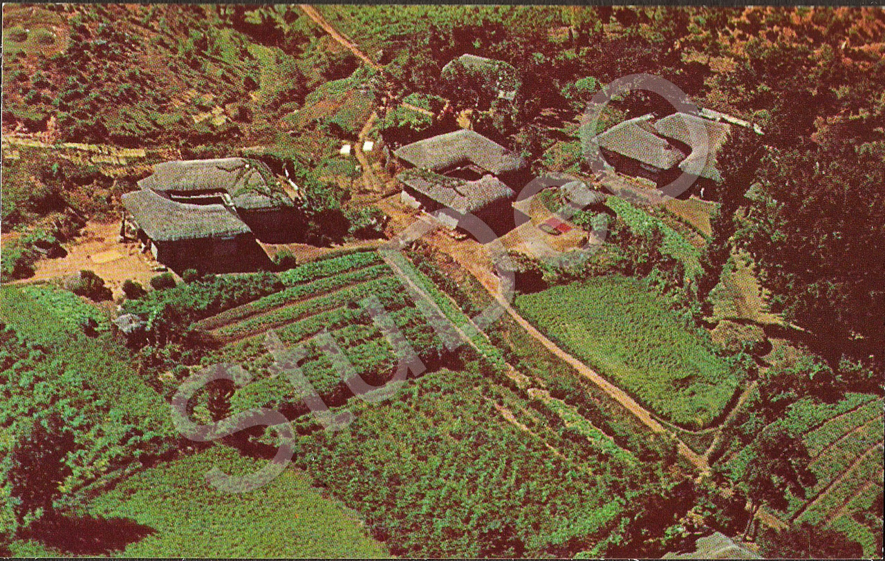Beschreibung: Postkarte „Korea from the air presents a geometric pattern of a tharched huts, mountainous gardens and ric paddies”. Bauerngehöfte mit strohbedeckten Hütten.