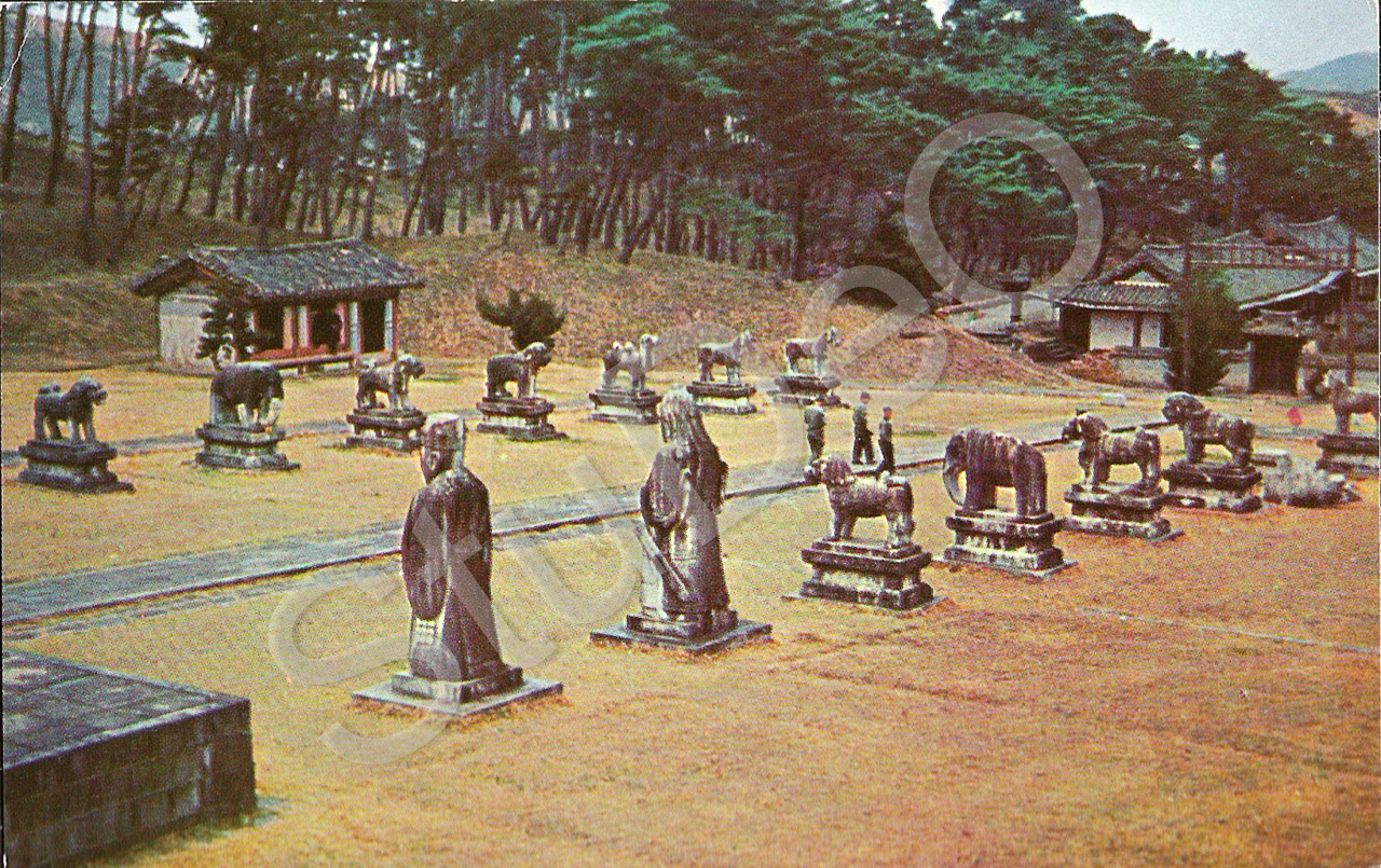 Beschreibung: Steintierallee zu Kaiser Gräbern. Postkarte. Vermutlich in Seoul.