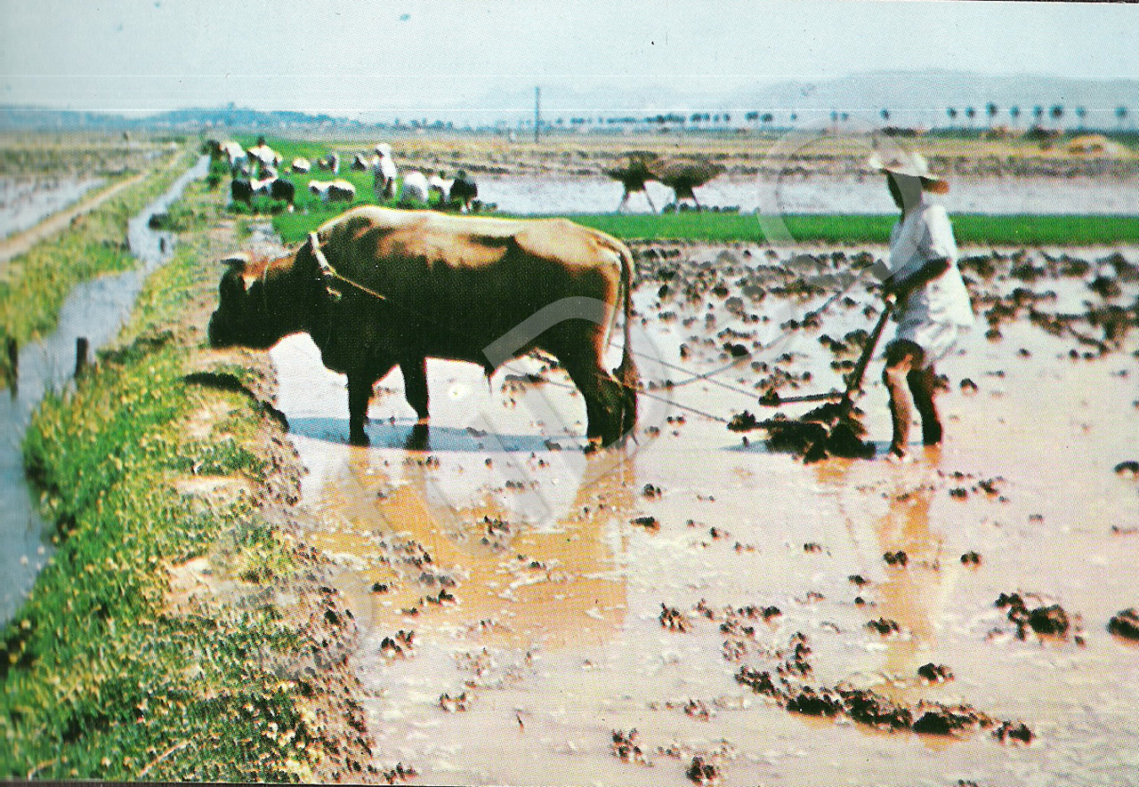 Beschreibung: Postkarte. Flügen mit Ochsenflug für den Reisanbau.