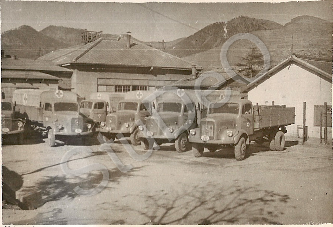 Beschreibung: Wagenpark des Rote Kreuz Hospitals Pusan besteht aus 5 LKWs, 3 VW-Bussen (nicht im Bild), 1 VW-Käfer (auf P6194 zu sehen), und 1 Unimog.