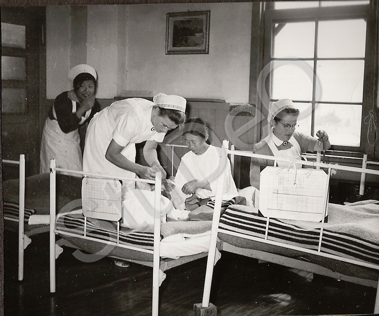 Beschreibung: Mehrbett-Krankensaal für Frauen im Rote Kreuz Hospital Pusan. Kran­kenschwestern bei der Arbeit.