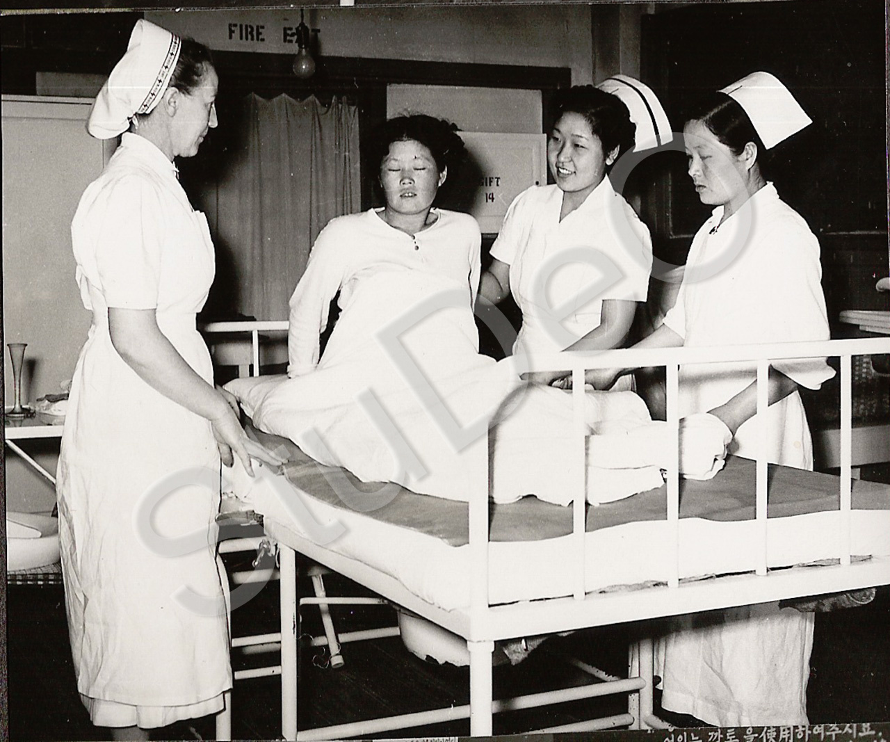 Beschreibung: Krankensaal für Frauen im Rote Kreuz Hospital Pusan. Kran­kenschwes­tern bei einer Patientin.
